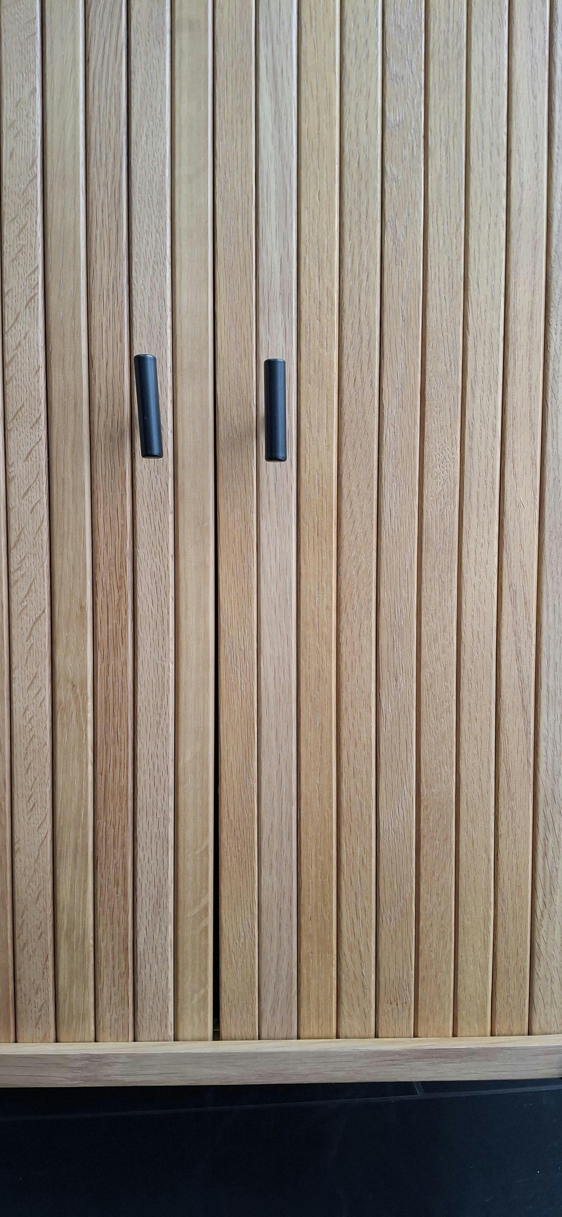 Die Rolltüren gleiten erstaunlich gut in der Führung (obwohl die Lamellen ja direkt auf dem Holz in der Führung gleiten). Die Kommode sieht sehr schön aus. Und die Größe und die Proportionen sind sehr gefällig.