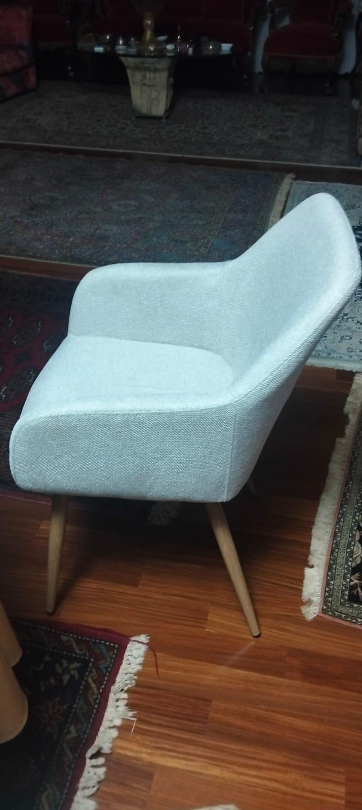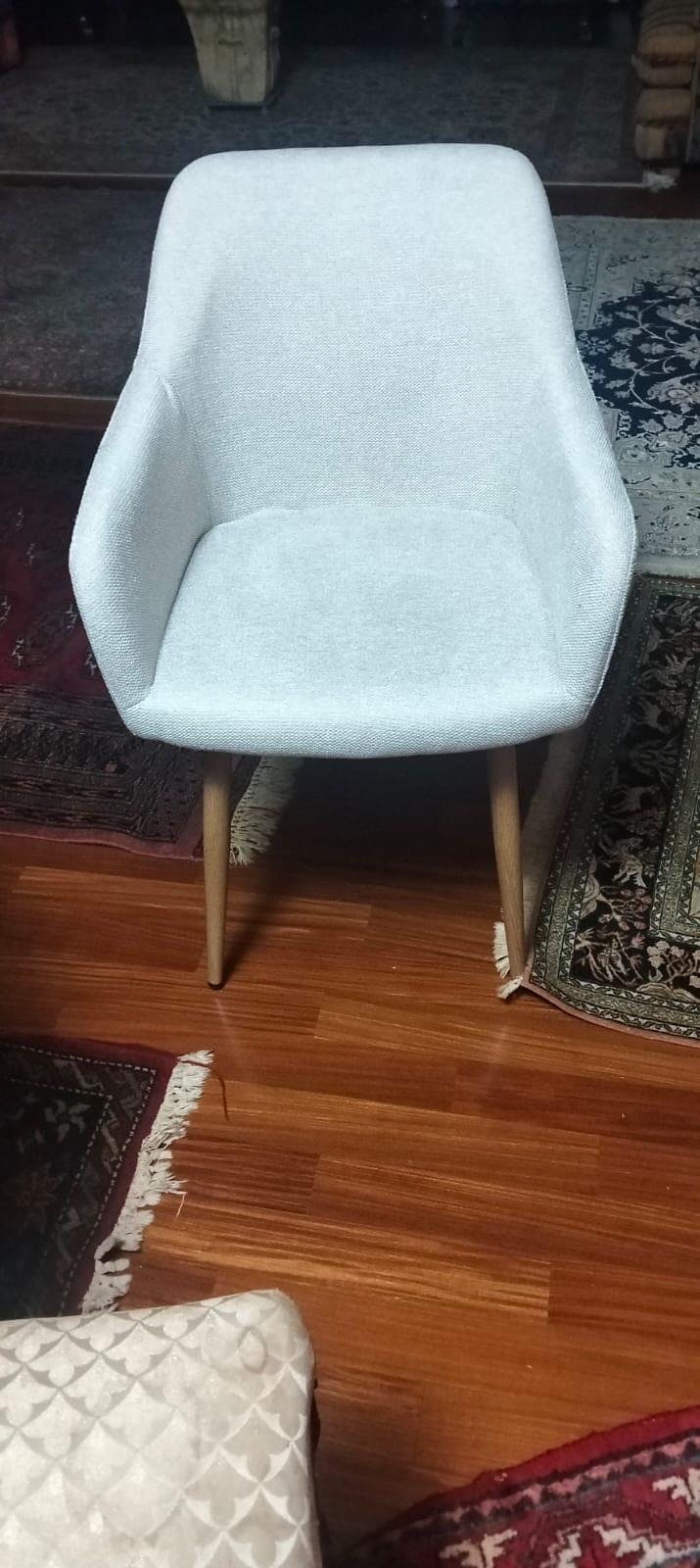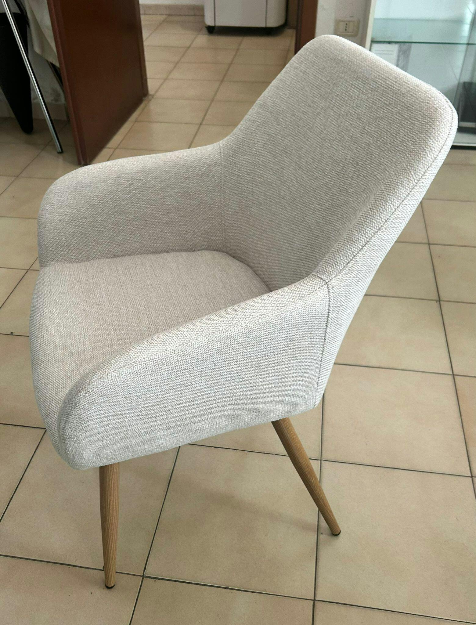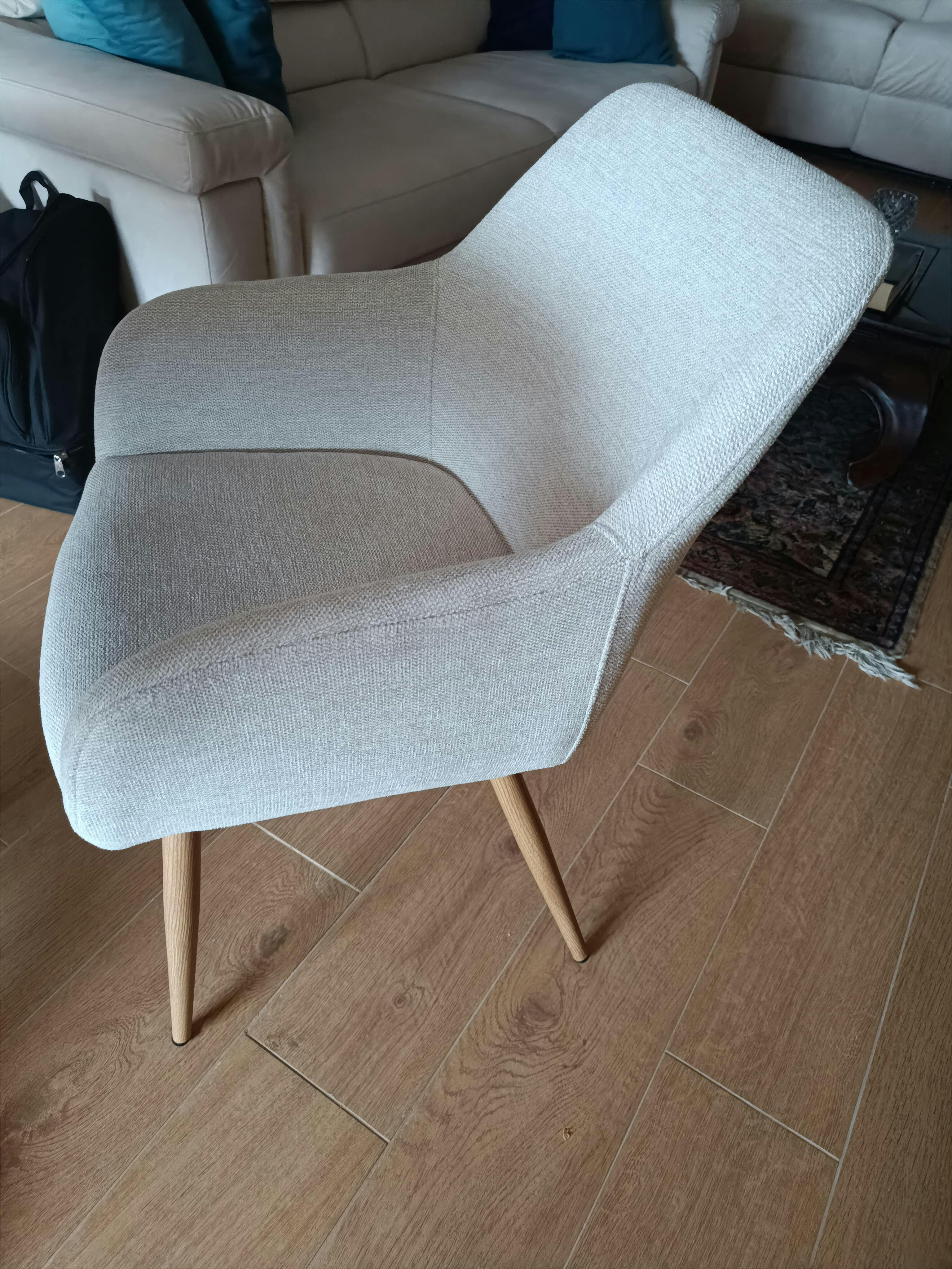 Het zachte beige textiel en de metalen poten met eiken uitstraling creëren een uitnodigende sfeer. De gestructureerde bekleding zorgt voor comfort.Van diners met familie en vrienden tot stille momenten alleen, deze stoel biedt uitstekend comfort en functionaliteit. De neutrale kleur, eenvoudige en moderne uitstraling maken de stoel perfect voor elk interieur.